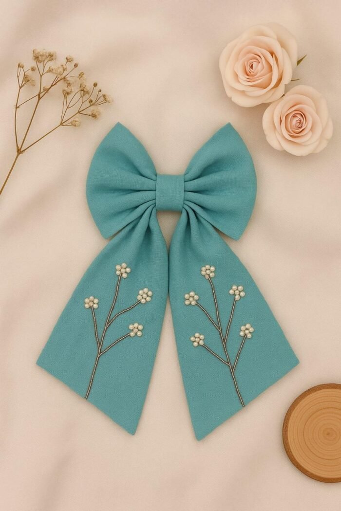 Shop the Aqua Blossom Hairbow a cotton bow with pearl floral designs and branch embroidery (silk, anchor & cotton threads). Handmade, elegant, and customizable via WhatsApp.