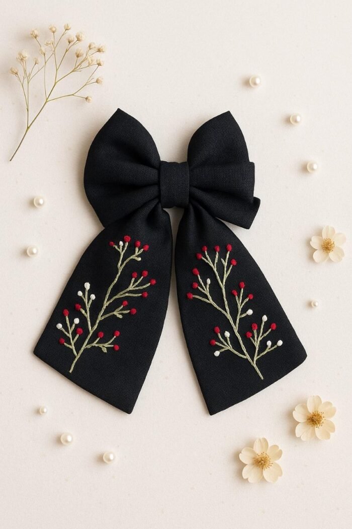 Shop the BlackBerry Charm Hairbow, a handmade cotton hair accessory featuring elegant berry-inspired embroidery in silk, anchor & cotton threads. A chic and versatile handmade bow. Custom orders available via WhatsApp.