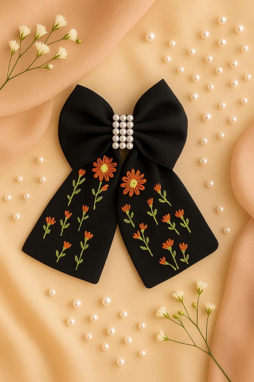 Shop the Bloom Pearl Hairbow, crafted from cotton fabric with a pearl centerpiece and floral embroidery using silk, anchor & cotton threads. A bold, handmade accessory for any occasion. Custom orders available via WhatsApp.