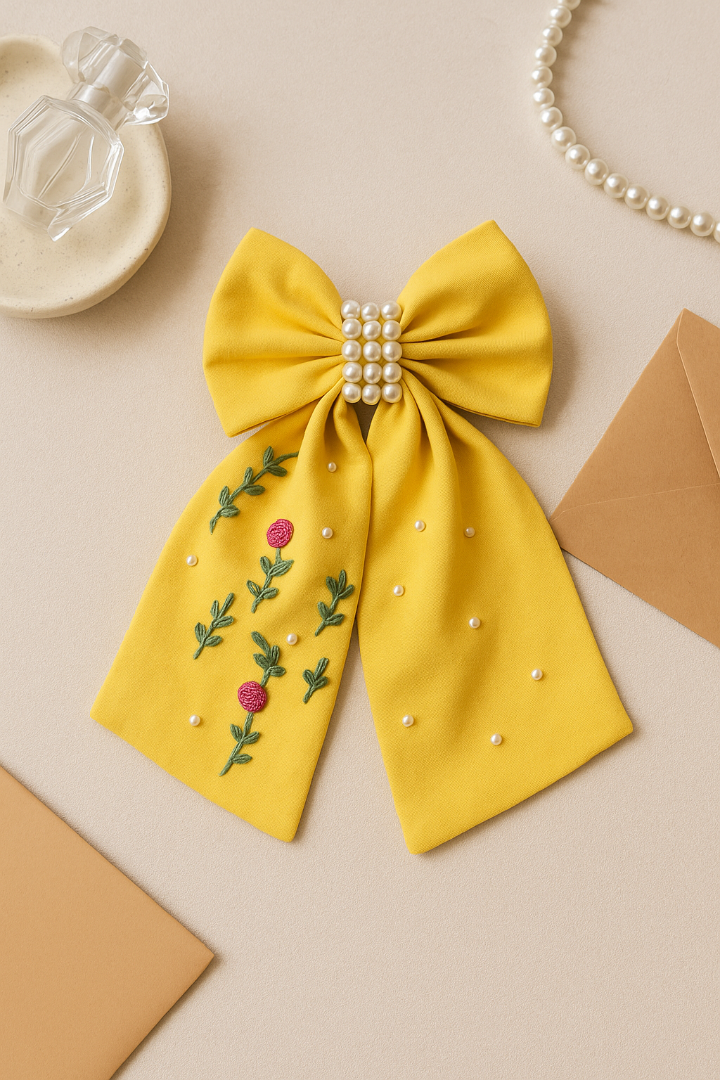 Add a pop of joy to your style with our Bloom Pearl Hairbow a blend of comfort, elegance, and craftsmanship. Made from soft cotton fabric, this bow is decorated with elegant pearls and floral embroidery using silk, anchor, and cotton threads, creating a vibrant yet classy accessory. Perfect for everyday wear, festive occasions, or gifting someone special, this bow radiates charm and timeless beauty.