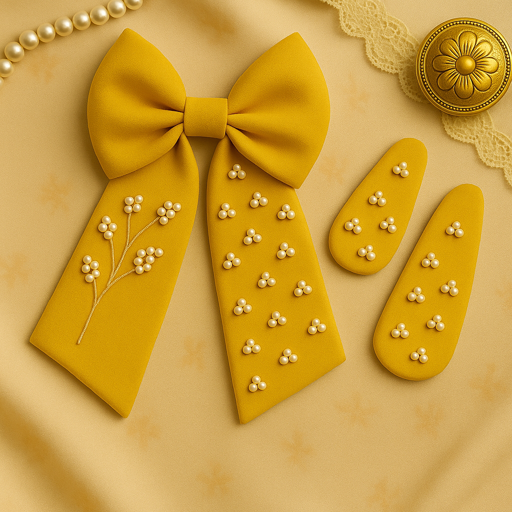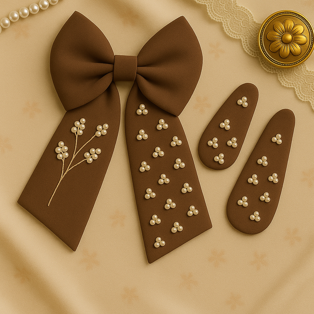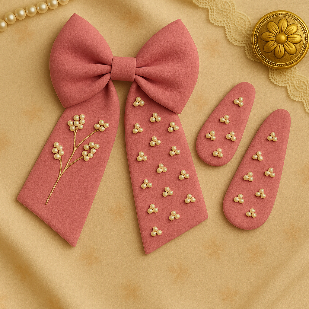 A graceful, handmade hair bow crafted from 100% cotton fabric and finished with pearl clusters. The embroidery is done entirely with pearls, creating a delicate botanical look that elevates everyday outfits and occasion wear alike.