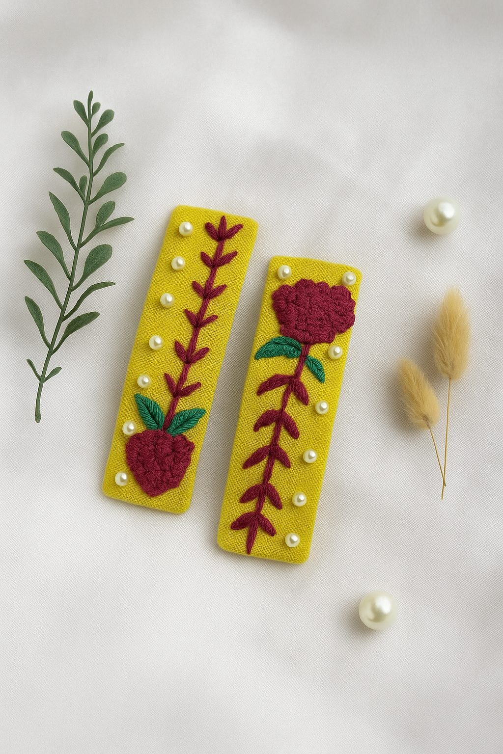 Shop Crimson Blossom Handmade Hairpins made with cotton fabric, embellished with pearls, and floral embroidery using silk, anchor, and cotton threads. Custom designs available on WhatsApp!