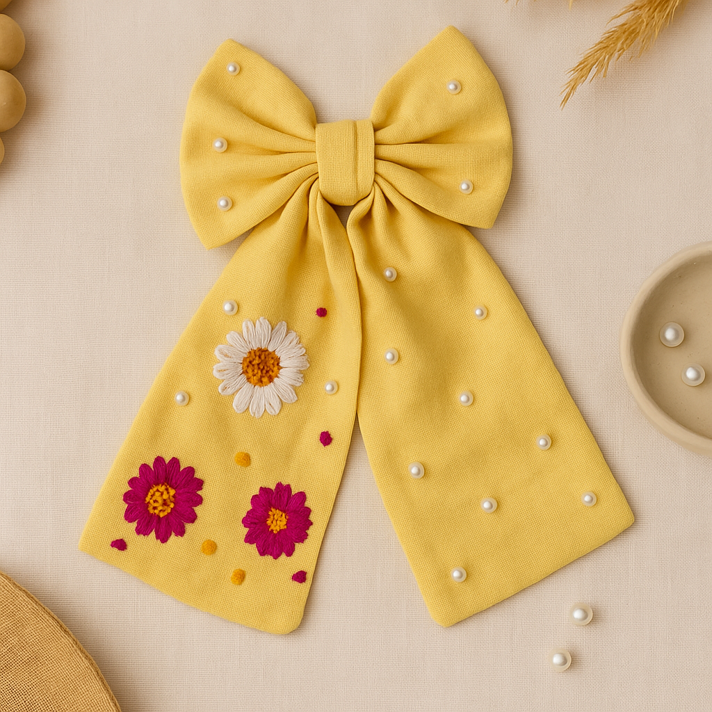 Add a refreshing floral charm to your look with the Daisy Bloom Pearl Hairbow, handcrafted with love and elegance. The bow is made from soft cotton fabric, while the delicate detailing of pearls and floral embroidery crafted with a blend of silk, anchor, and cotton threads makes it a graceful accessory.