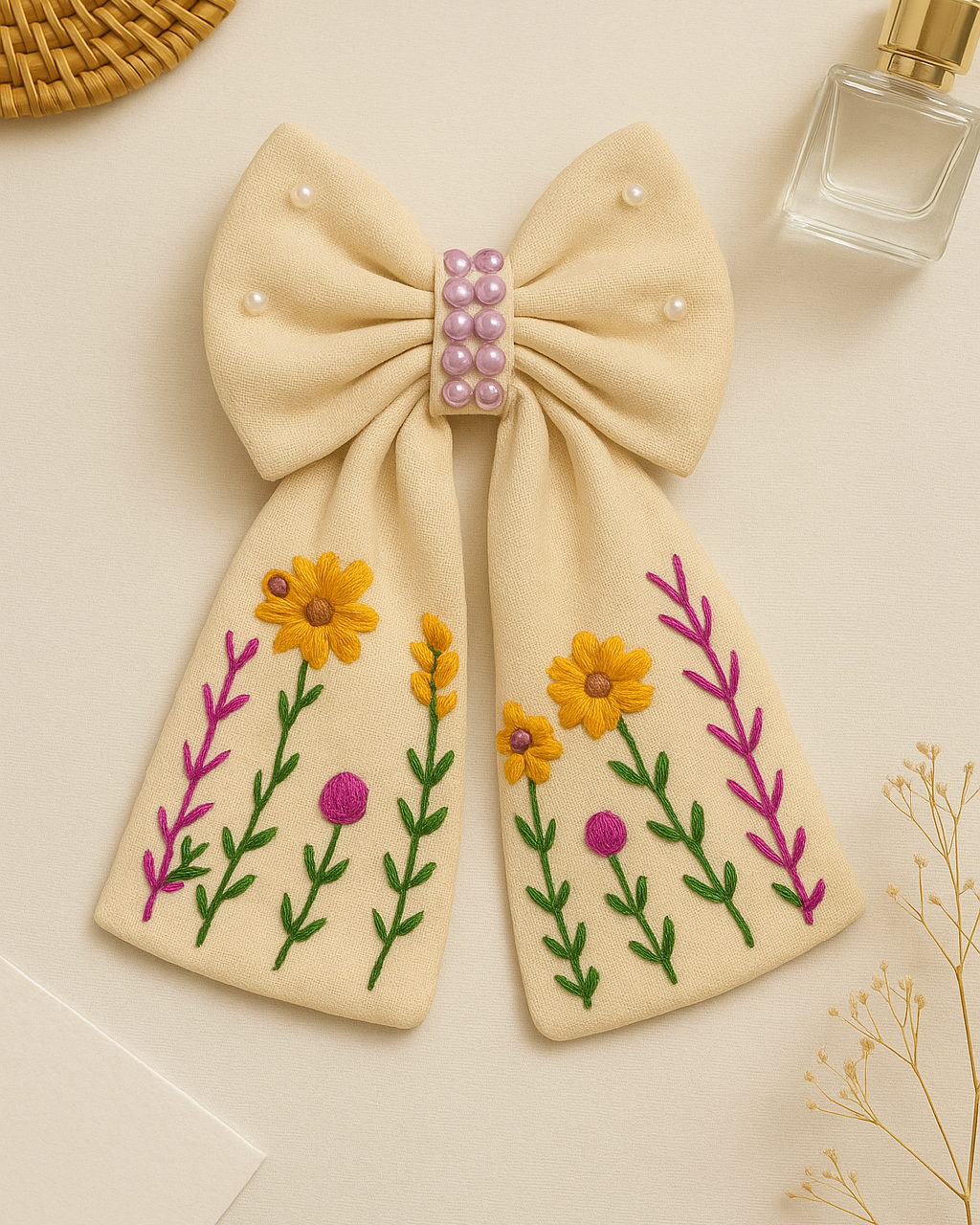 This handcrafted cotton hairbow is beautifully detailed with pearls and delicate floral embroidery. The embroidery is crafted using a rich blend of silk, anchor, and cotton threads, creating vibrant textures and elegant detailing. Perfect for casual wear, parties, or gifting, this bow combines elegance with comfort.