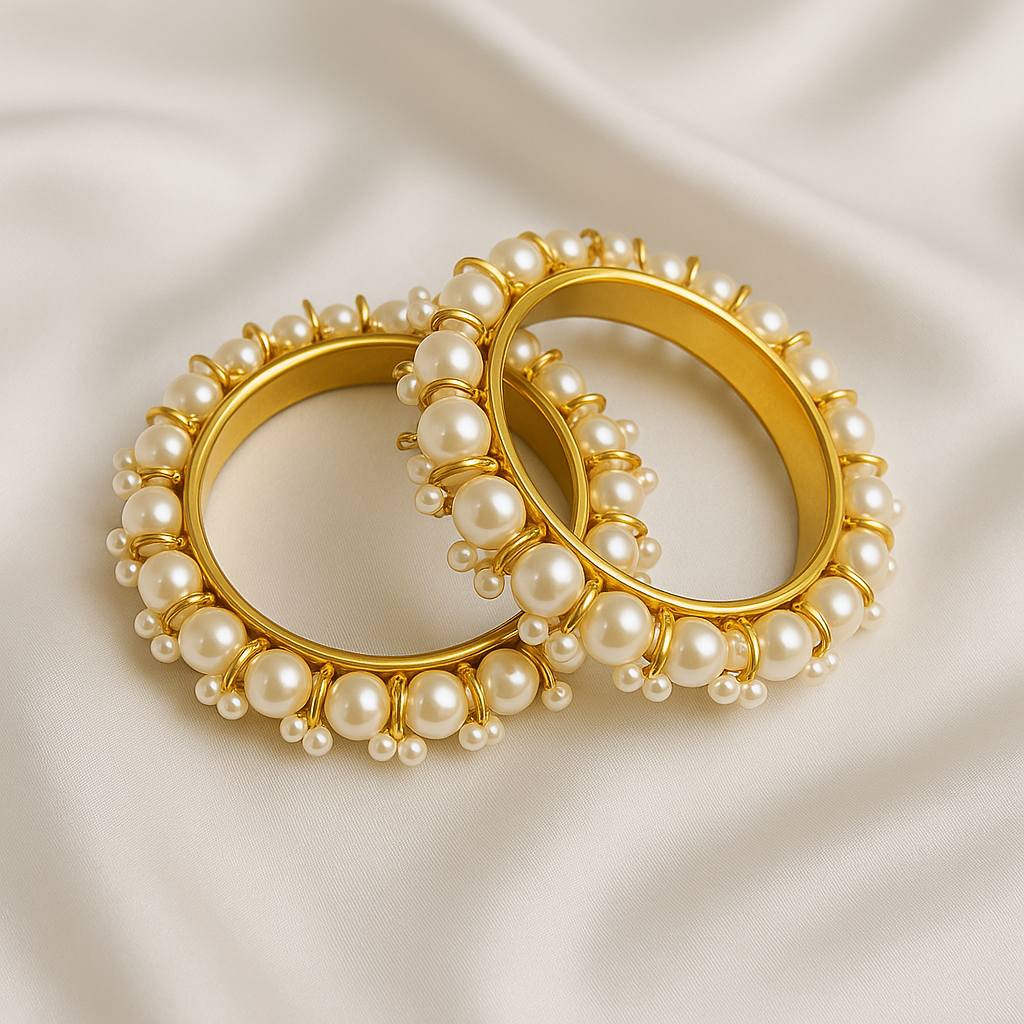 Elevate your festive look with our  Gajra Kadas. Designed to reflect classic elegance, these stunning kadas are adorned with bold pearl clusters encircling a radiant golden base, creating a gajra-inspired look. Whether styled with a traditional outfit or gifted as part of a bangle box, these kadas add the perfect finishing touch. Ideal for mehndi, baraat, or formal celebrations. Set includes 2 kadas as shown.