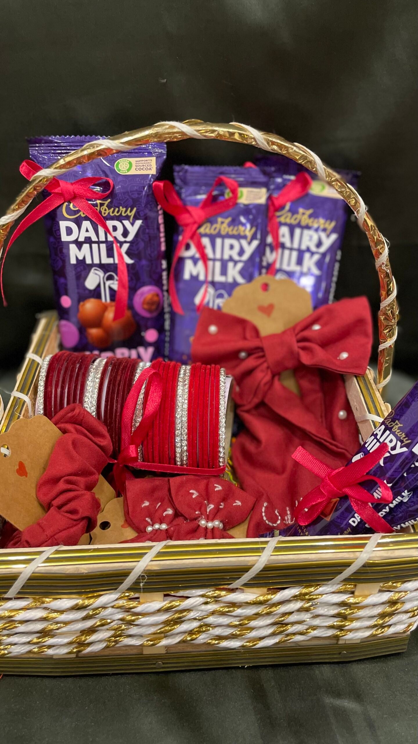 Indulge your loved one with the Lovely Chocolate Hamper, a thoughtfully curated gift basket filled with delightful chocolates and charming red-themed accessories. Featuring Cadbury Dairy Milk chocolates, elegant bangles, soft velvet accents, and beautiful ribbon detailing, this hamper is designed to express love and sweetness in the most memorable way.