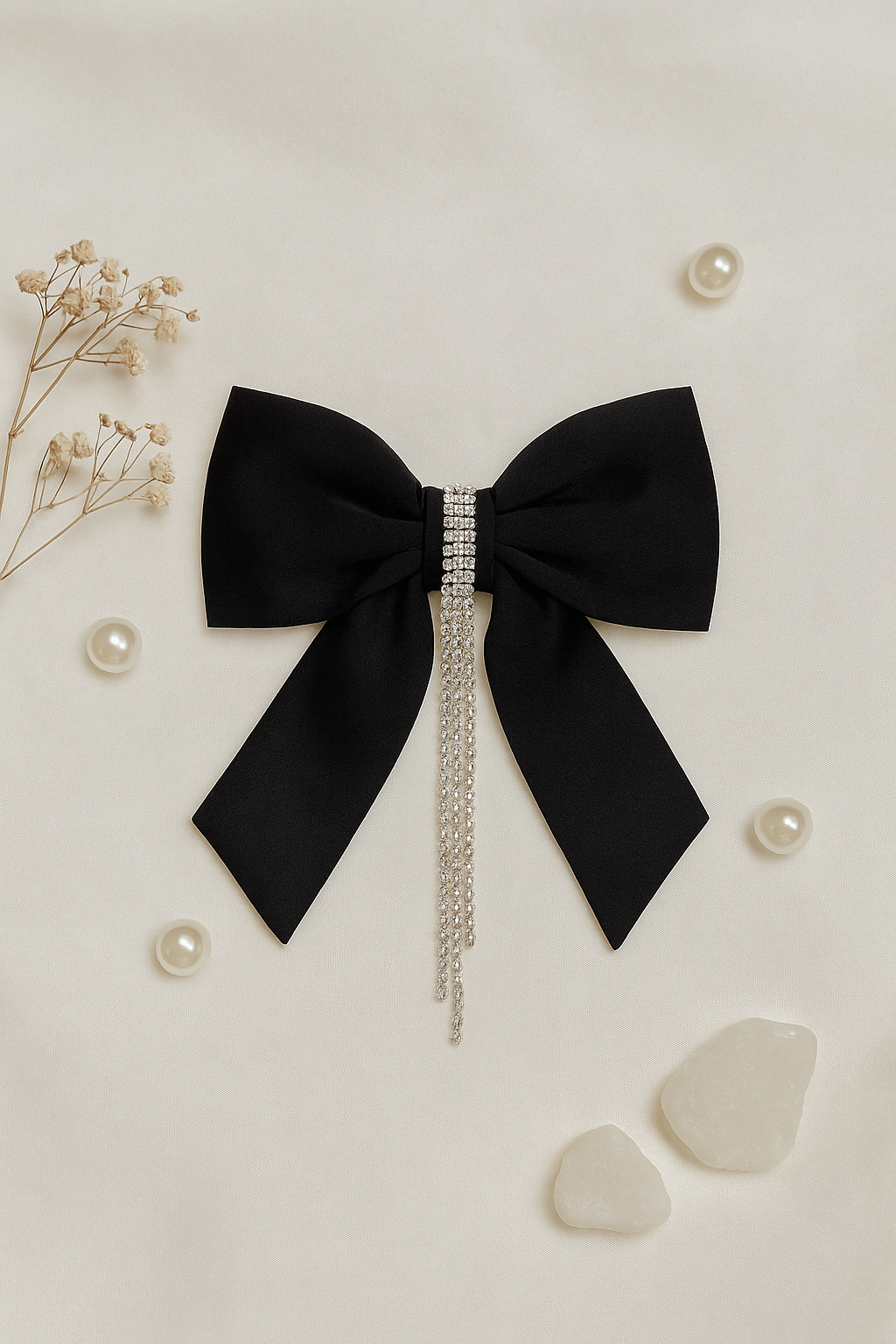 Shop Midnight Glam Rhinestone Hairbow made with silk fabric and decorated with sparkling silver rhinestones. Perfect for parties, occasions, and custom orders via WhatsApp!