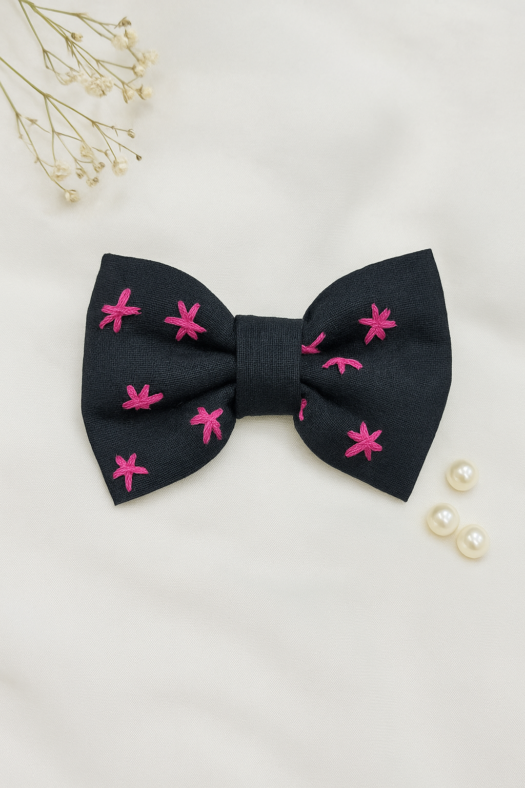 Shop Midnight Star Handmade Hairbow made with cotton fabric, pearls, and fine embroidery using silk, anchor, and cotton threads. Elegant and customizable via WhatsApp!