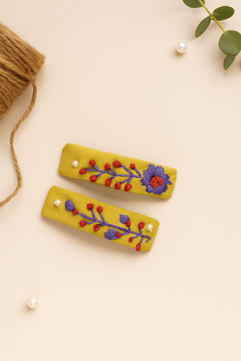 Shop the Mustard Blossom Hairpin Set handcrafted from cotton fabric with silk and anchor thread embroidery. Finished with pearls for a delicate touch. Custom designs available via WhatsApp.