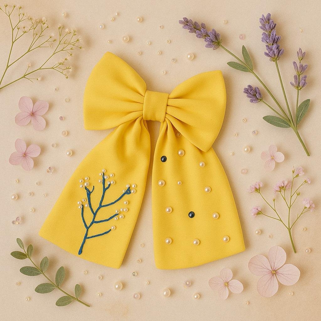 This mustard yellow cotton hairbow is a perfect statement piece that blends elegance with handcrafted artistry. Made from soft cotton fabric, it features a graceful design highlighted by pearls and a delicate branch embroidery pattern. The embroidery is crafted using a fine mix of silk, anchor, and cotton threads, adding both texture and sophistication. Ideal for everyday wear or special occasions. For personalized designs, feel free to WhatsApp us for customized hairbows.