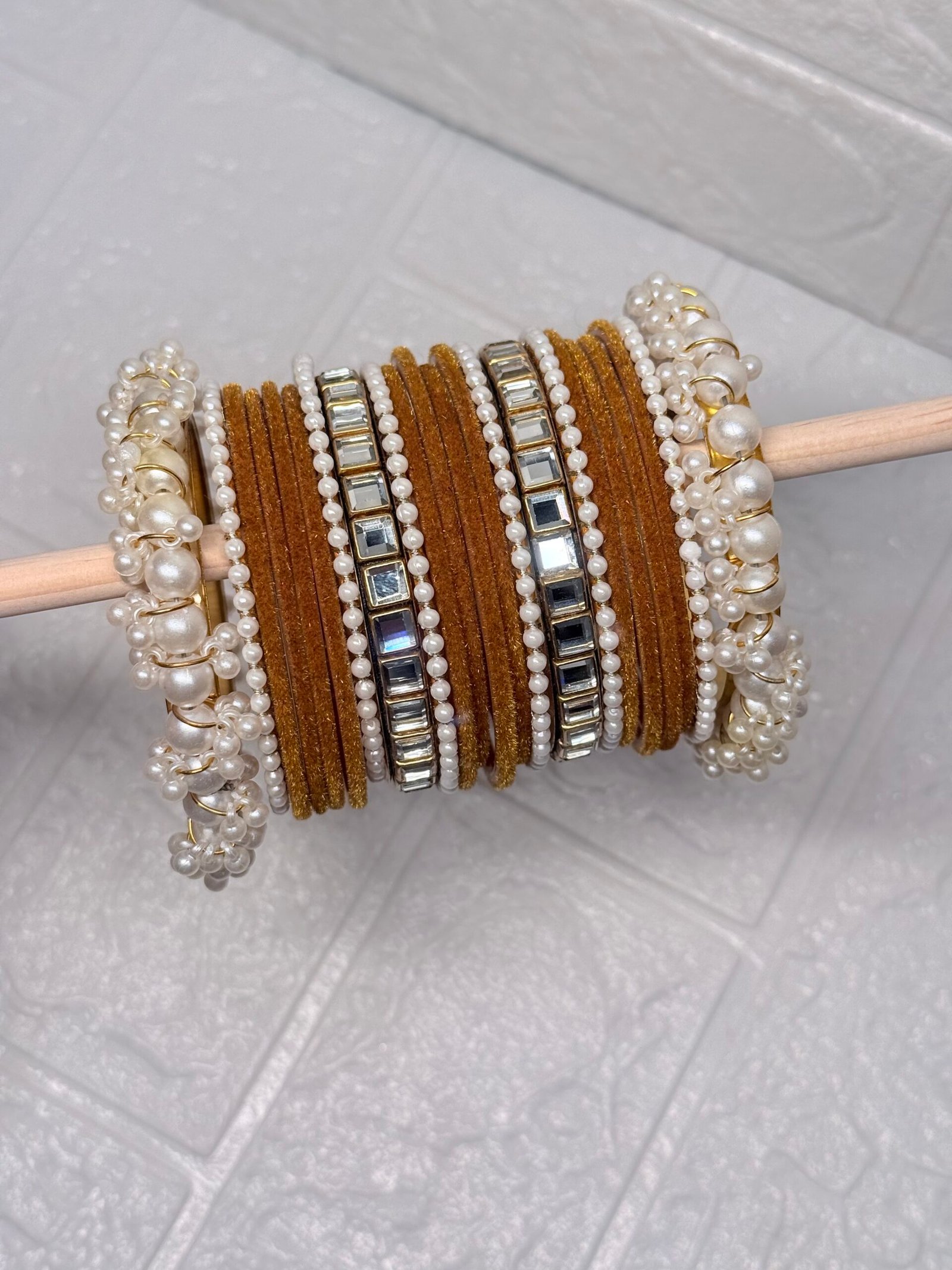 Elegant amber velvet bangles adorned with pearls and mirror accents, perfect for festive and formal wear. Customization available via WhatsApp.