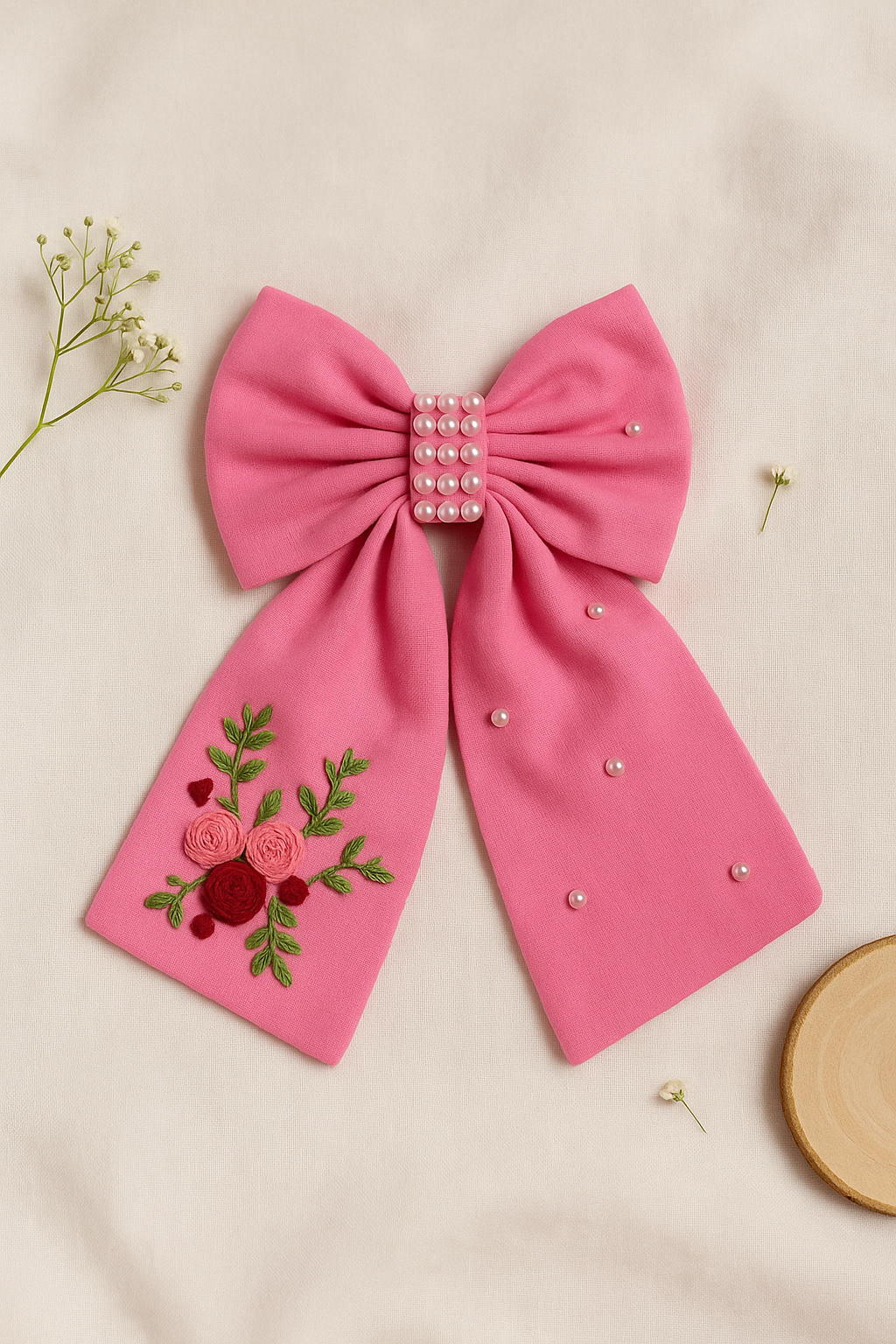 Handmade cotton hairbow with pearl accents and rose floral embroidery crafted using silk, Anchor & cotton threads. Boutique finish. Customizable on WhatsApp.