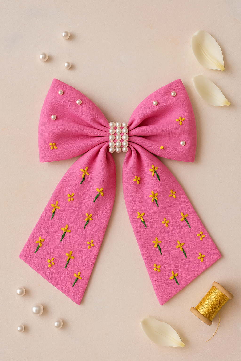 Handmade statement hairbow crafted from soft cotton fabric, finished with elegant pearl accents. The floral embroidery is a refined blend of silk, anchor, and cotton threads, giving a delicate, dimensional look that sits beautifully in photos and in real life.