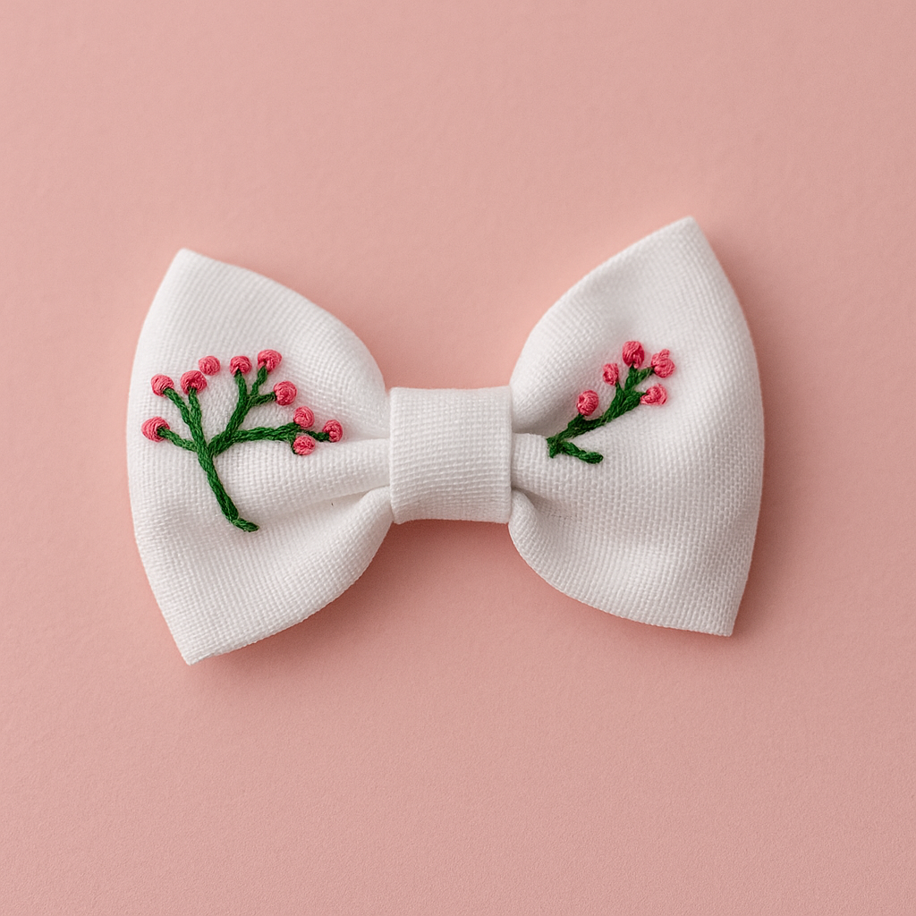 Delicate and refreshing, the Sky Petal Hairbow features a soft sky blue base adorned with hand-embroidered pink blossoms and green leafy stems. Its soothing color and floral detailing make it a charming pick for both everyday looks and special outfits. A perfect blend of simplicity and elegance for your little one’s accessory collection.