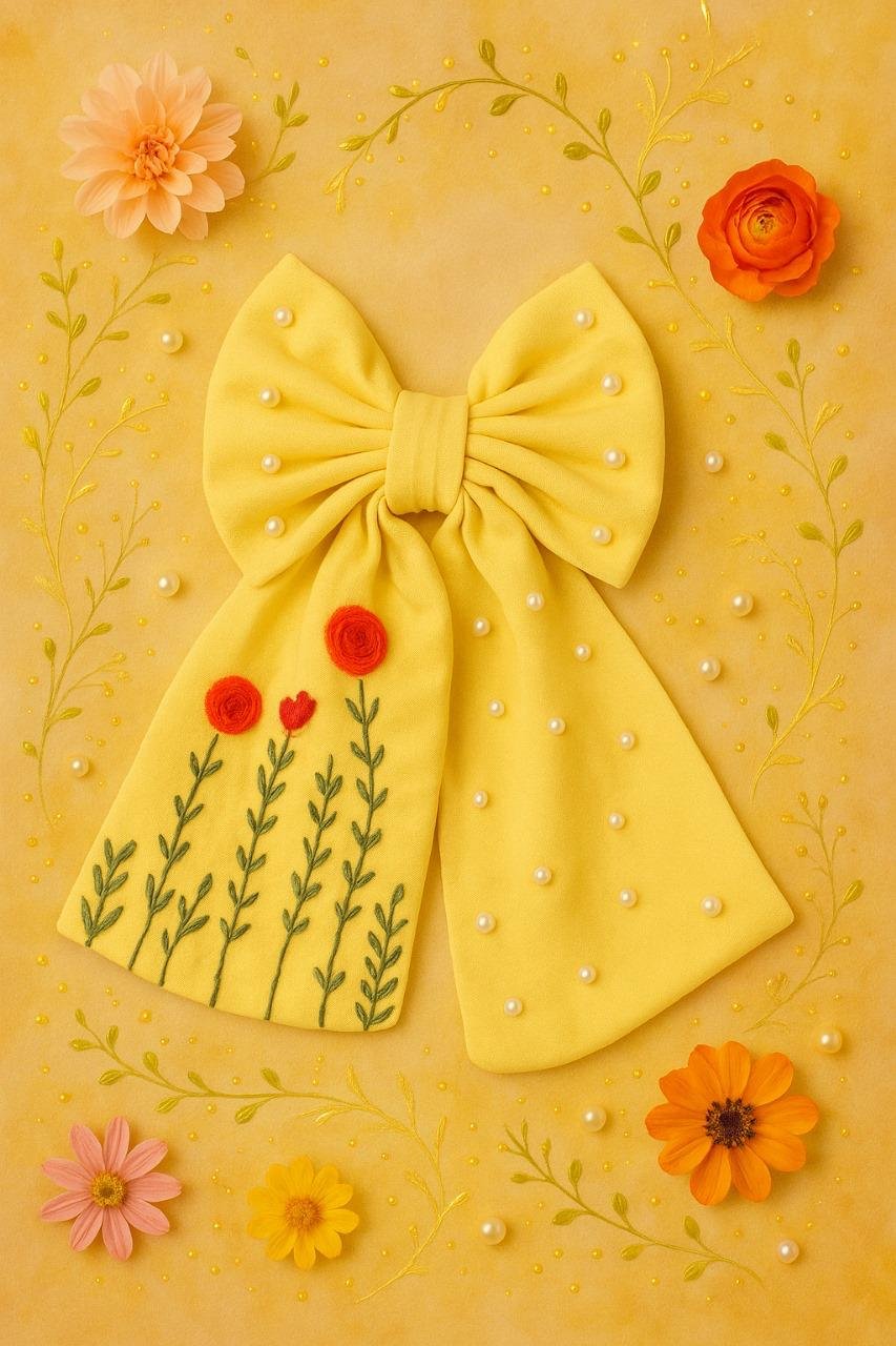 The Sunflower Meadow Hairbow is a bright and elegant handmade accessory crafted from premium cotton fabric. Its beauty is enhanced with delicate pearls and charming floral embroidery featuring vibrant red blooms and green stems. The embroidery is carefully hand-stitched using a fine mix of silk, anchor, and cotton threads, making it both graceful and durable. Perfect for adding a cheerful touch to festive and casual looks. For personalized styles, you can also WhatsApp us for customized hairbows.