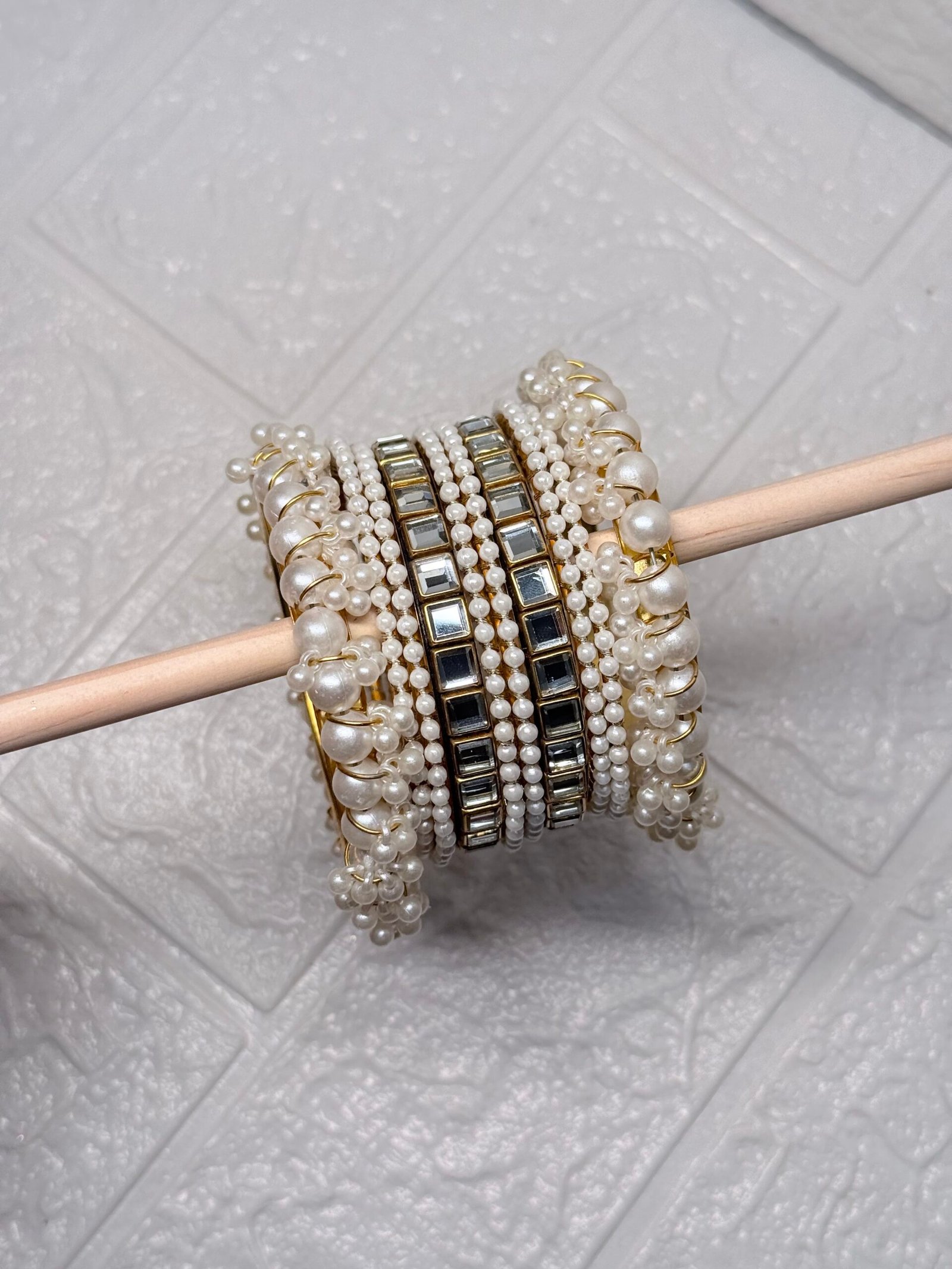 Elegant bangles featuring white pearls and mirror detailing, ideal for bridal, festive, and formal wear.
